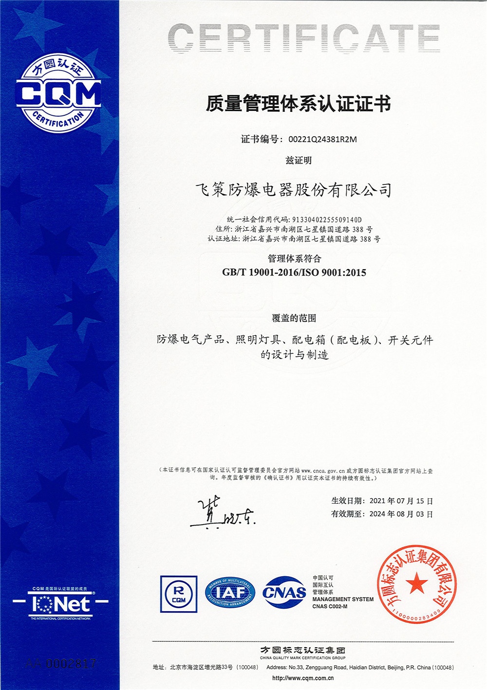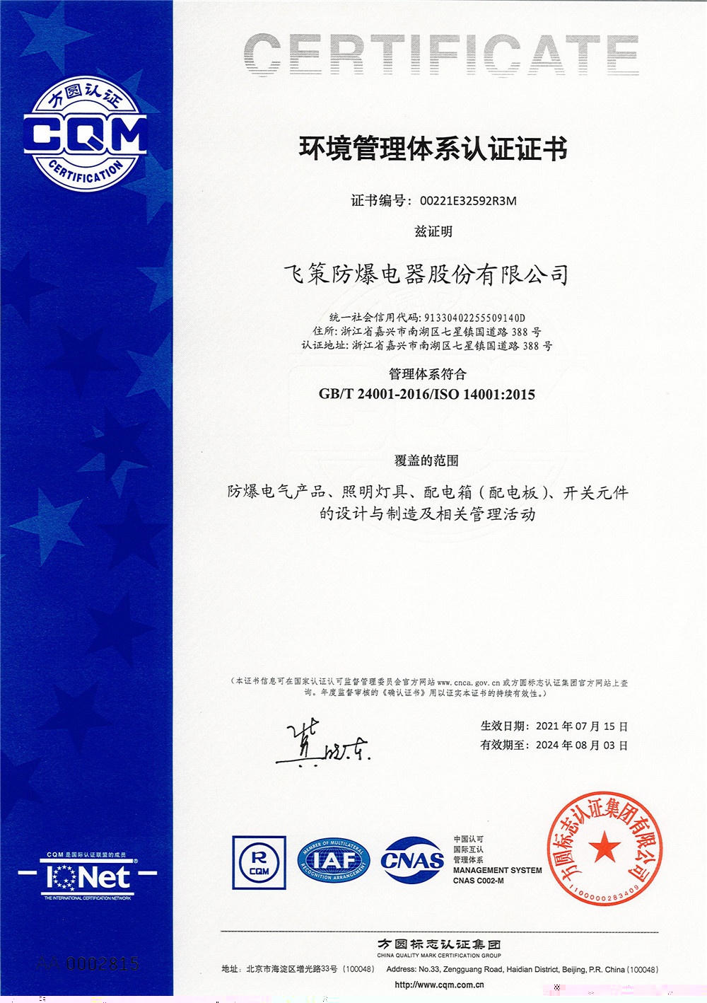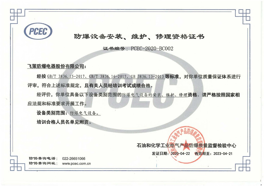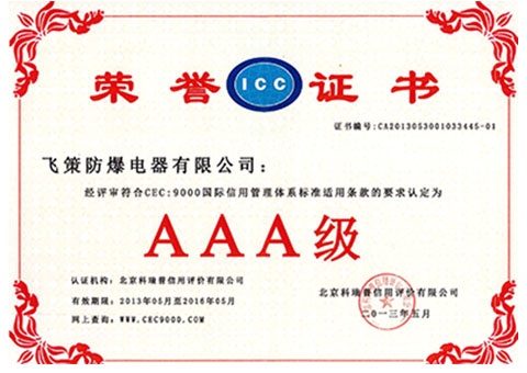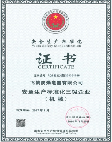 公司通過IS09001質(zhì)量管理體系、ISO14001環(huán)境管理體系、ISO10012測量管理體系及OHSAS18001職業(yè)健康安全管理體系認(rèn)證,同時(shí)公司與國際全面接軌已先后獲得歐盟ATEX、國際IECEx、俄羅斯CU TR等國際認(rèn)證。是中國防爆電器協(xié)會(huì)副理事長單位、全國防爆電氣設(shè)備標(biāo)準(zhǔn)化技術(shù)委員會(huì)委員單位。